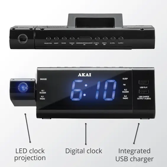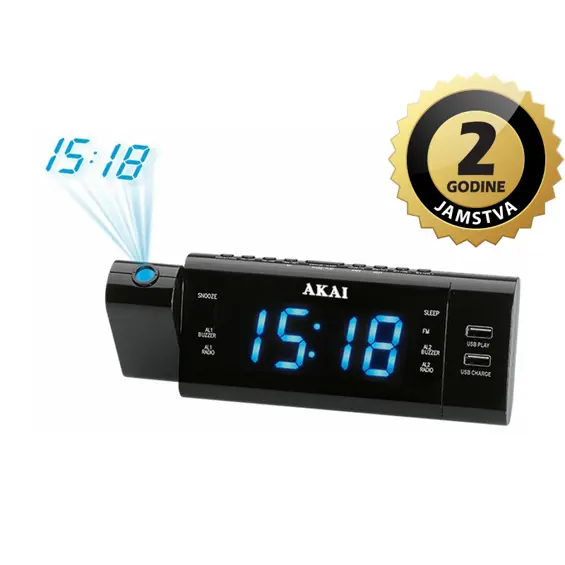 AKAI budilica s projektorom ACR-3888, FM/AM radio, LCD, USB MP3, USB punjač