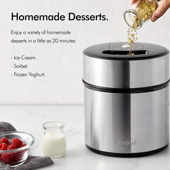 VonShef Aparat za Sladoled, Sorbet i Smrznuti Jogurt – 1.5 L Kapacitet, Brza Priprema u 20 Minuta, Bijeli/Srebrni