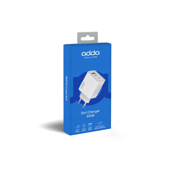 Zidni punjač Adda Collins CH-007-WH, USB-A i Type C izlazi, 30W, bijela